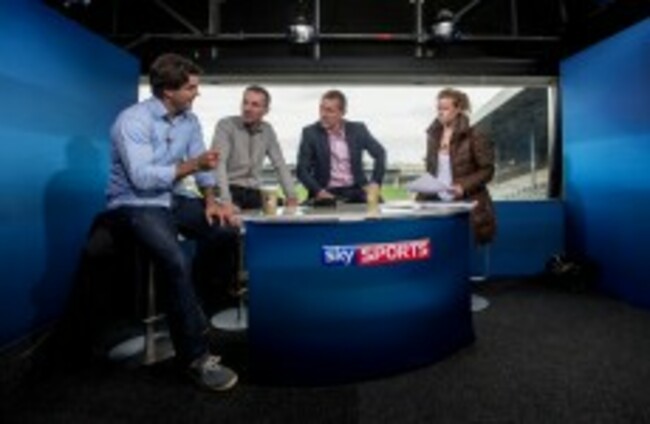 Sky Sports pundits Ollie Canning and Jamesie O'Connor with presenters Brian Carney and Rachel Wyse before last year's Kilkenny Offaly match. James Crombie/INPHO