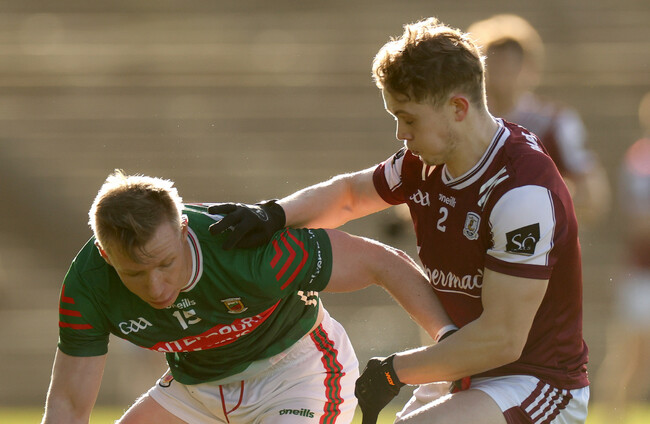 Galway's Johnny McGrath with Ryan O'Donoghue of Mayo in the 2023 league final. Ben Brady / INPHO
