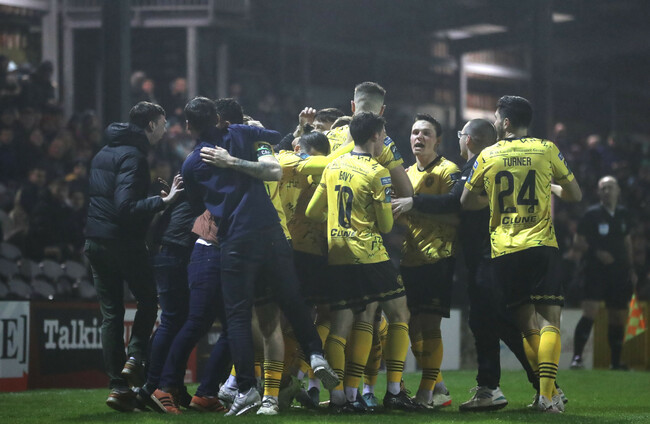 St Pat's players celebrate taking the lead against Galway United. Bryan Keane/INPHO