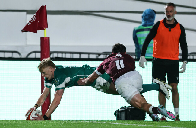 Ireland turn the ball over at the scrum and attack left to right. Jimmy O’Brien steps a defender but his pass is loose, although Tommy O’Brien reacts well to flick a pass to Prendergast. The out-half dives for the corner and gets the ball down, but his foot looks in touch.