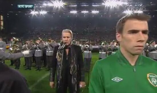 Next up, Johnny Logan time. The former Eurovision winner is singing the national anthems.