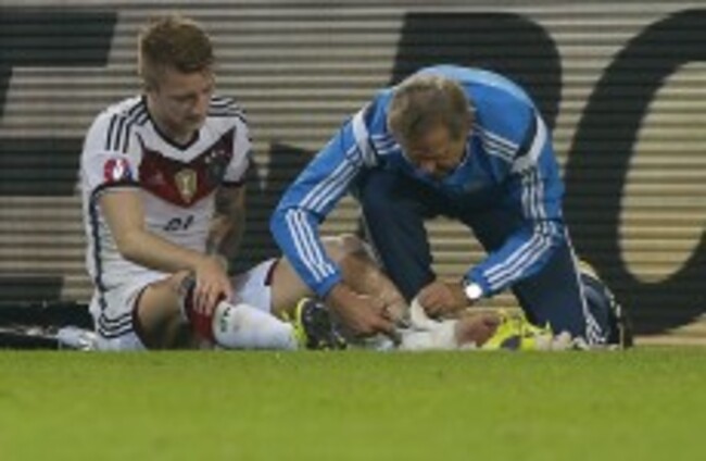 GERMANY MUST AGAIN do without winger Marco Reus for their key Euro 2016 qualifier against Group D leaders Poland tomorrow after the Borussia Dortmund star suffered a toe injury.