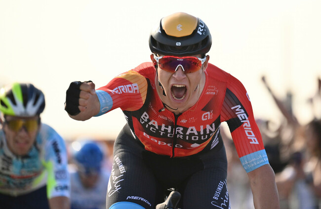 Australia’s Kaden Groves led the early sprint pace but the giant Italian Milan was right on his wheel, and timed his run to win by a full bike length as David Dekker sneaked second.