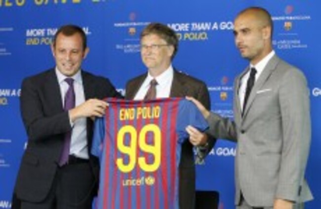 Bill Gates co-chair of the Bill & Melinda Gates Foundation, center, with FC Barcelona President Sandro Rosell, left and coach Pep Guardiola. Luis Magana/AP/Press Association Image