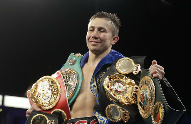 Gennady Golovkin poses with his belts after defeating Vanes Martirosyan. Chris Carlson