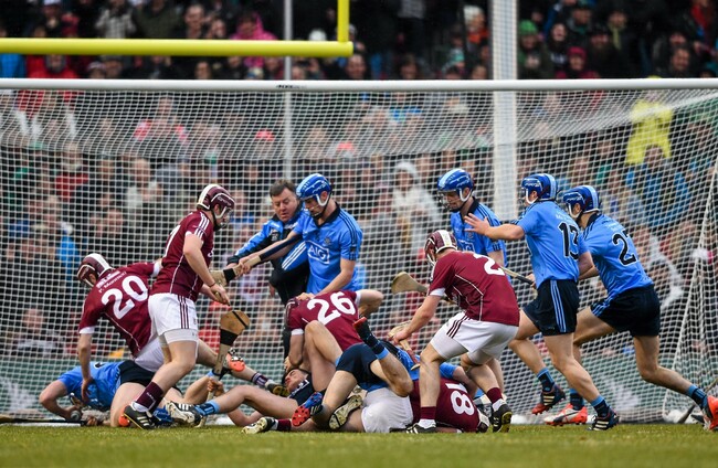 Galway's James Skehill and Eamon Dillon of Dublin go at it. Emily Harney / INPHO