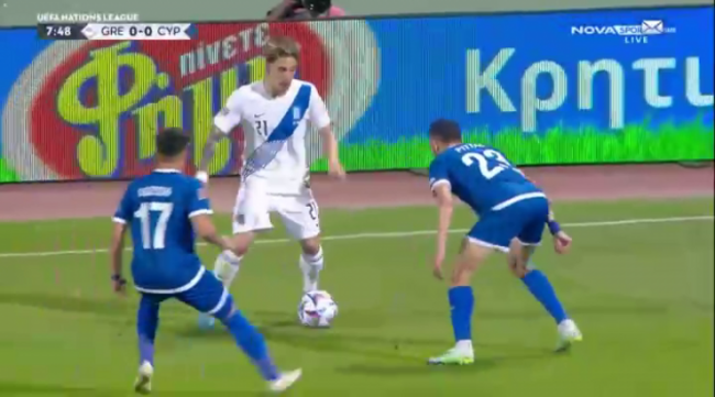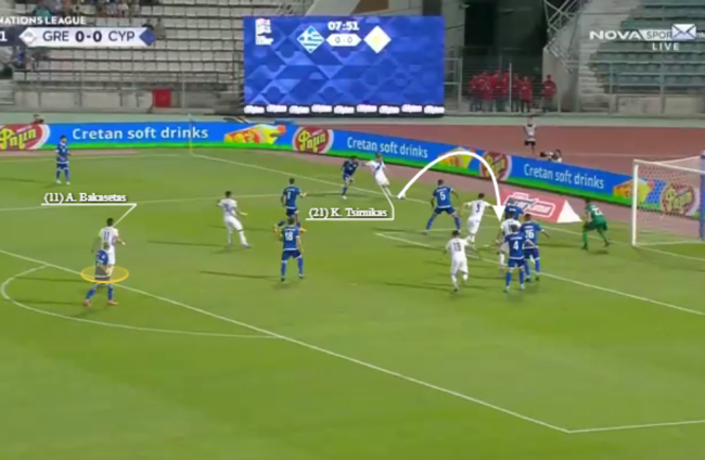 As Tsimikas plays a pass inside to Mantalos, Bakasetas makes the decision to check his run and pull back outside the box, brilliantly buying himself the time and space to get a shot away, that finds the bottom right corner this time.