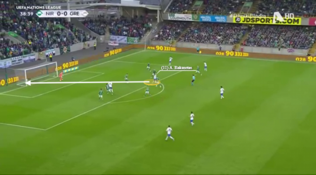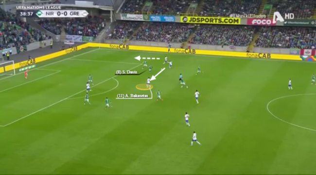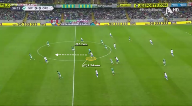 Here, in their opening game away to Northern Ireland, Greece break down the right. Steven Davis is the closest player to Bakasetas when the attack begins but he gets sucked across to the left because of the aforementioned threat provided by the full-back runs.