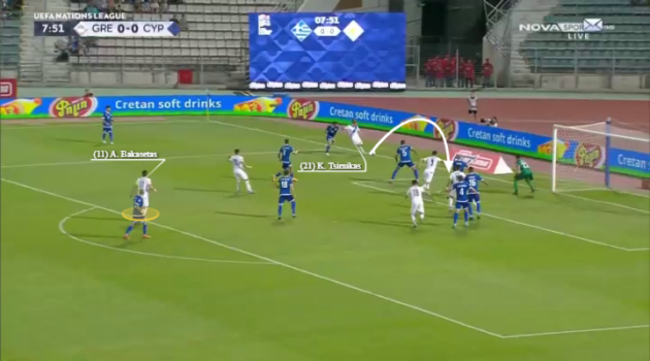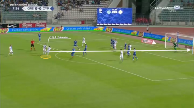 As the ball is delivered, we can already see Bakasetas loitering on the edge of the box with intent. The cross is headed clear but as it drops, he meets it on the volley and the shot fizzes through a crowd of bodies and past the keeper.