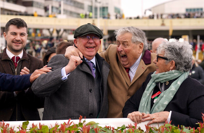 Alex Ferguson (centre), owner of Monmiral, celebrates after watching his horse win the Pertemps Network Final, which was ridden to victory by Harry Cobden (left). Alamy Stock Photo