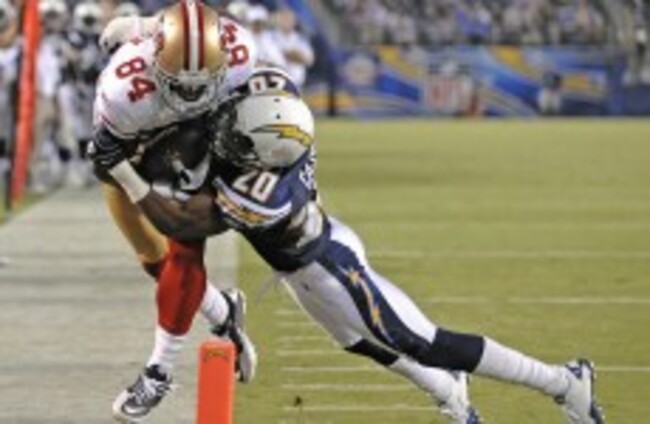 San Francisco 49ers wide receiver Josh Morgan is driven out of bounds by San Diego Chargers defensive back Antoine Cason. Denis Poroy/AP/Press Association Images