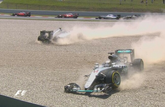 And when Hamilton tried to sneak up Rosberg’s inside, he was forced wide onto the grass verge and spun, clipping Rosberg and forcing both cars out.