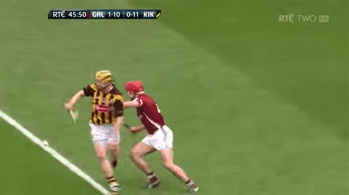 46: Shefflin’s desire is evident as he goes in hard on Fergal Moore. The Galway man falls to the deck and Shefflin indicates to referee Kelly that he feels it was a dive.