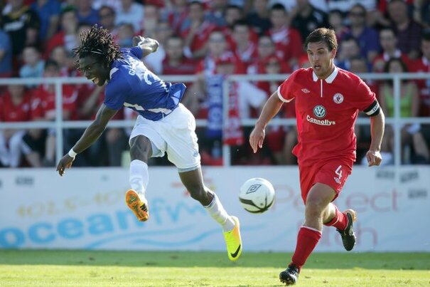 Sligo's Gavin Peers can only watch as Daniel Chima Chukwu of Molde scores at the Showgrounds