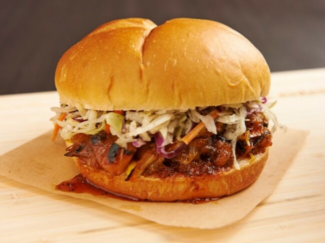 Description: Smoked-then-braised jackfruit, apple-jalapeño coleslaw, and house barbecue sauce on a sweet Hawaiian roll.