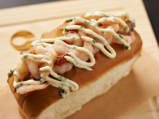 Description: Bay shrimp and braised fennel stuffed in a top-cut roll with a chive aioli.