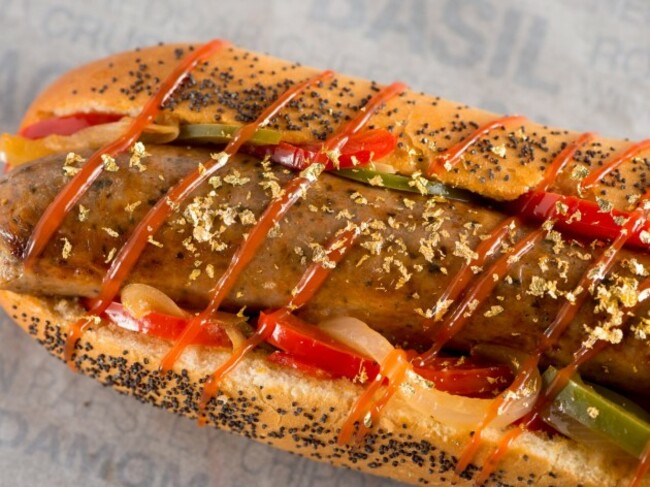 Description: Custom blend of 50 ingredients, including beef, pork, spices and herbs, grilled and served on a poppy seed bun with sautéed bell peppers and topped with tomato ketchup and gold flakes.