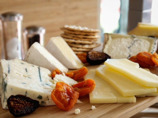 Description: A selection of ripened and fresh cheese from Pt. Reyes Blue, local aged Cheddar, Chatelaine Camembert, Cypress Grove Humboldt Fog, and Vella Cheese Co, aged Asiago, served with dried fruit, crackers and Melba toast; gluten-free crackers upon request.