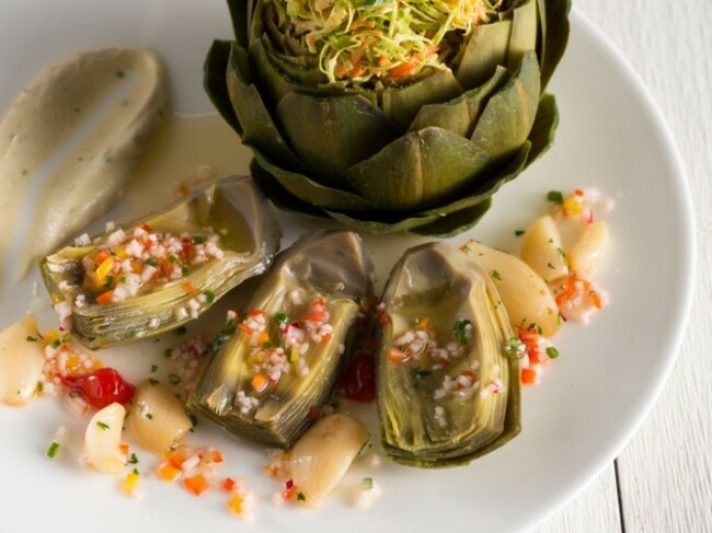 Description: Tender Castroville artichokes, roasted Gilroy garlic, and Pescadero Brussels sprouts slaw tossed in root vegetables vinaigrette; served with lemon aioli dip.