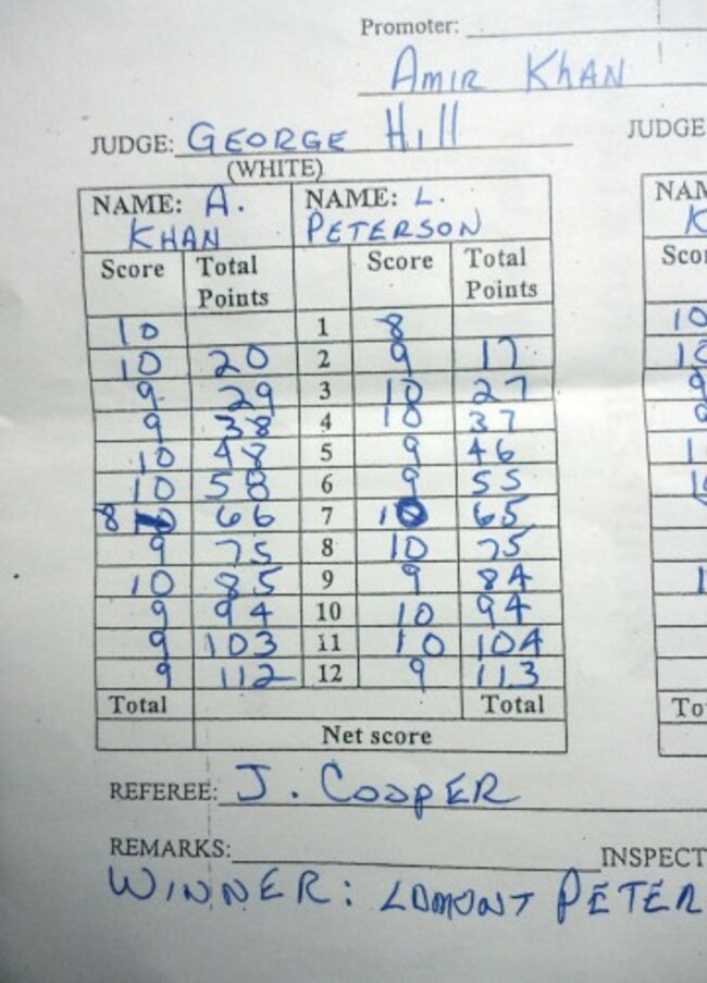 This is copy of judge George Hill’s scorecard from the bout at the George E Washington Convention Center in Washington, USA. The crossed-out 10 is a bone of contention. (Phil Barnett/PA Wire.)