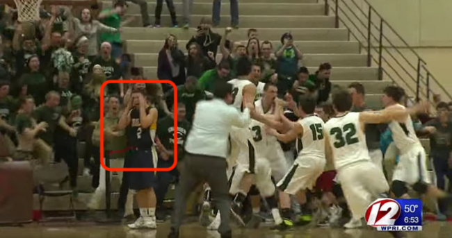 As the Burrillville player celebrated, he tossed the ball in the air as the team ran onto the court. However, a Chariho player caught the ball and called timeout before the buzzer sounded.