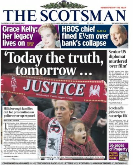 “Today the truth, tomorrow… justice” reads The Scotsman while the Times describes events as “vindication for Hillsborough families after 23-year struggle.”