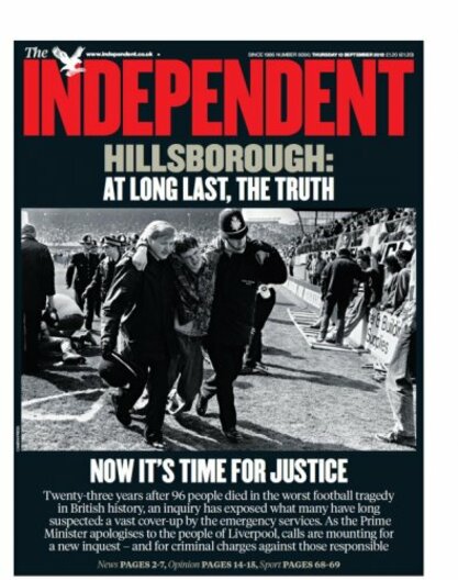 THE DAMNING FINDINGS of an independent report into the 1989 stadium disaster in which 96 Liverpool fans were killed dominate the front pages of Thursday’s newspapers in Britain, with one key word emphasised.