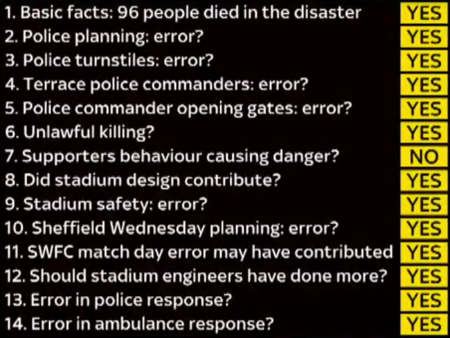 The jury came to their conclusions having deliberated on issues in relation to police planning before the game, stadium safety and the emergency services’ response to the unfolding disaster but the key question for family members was always whether or not the 96 fans were unlawfully killed.