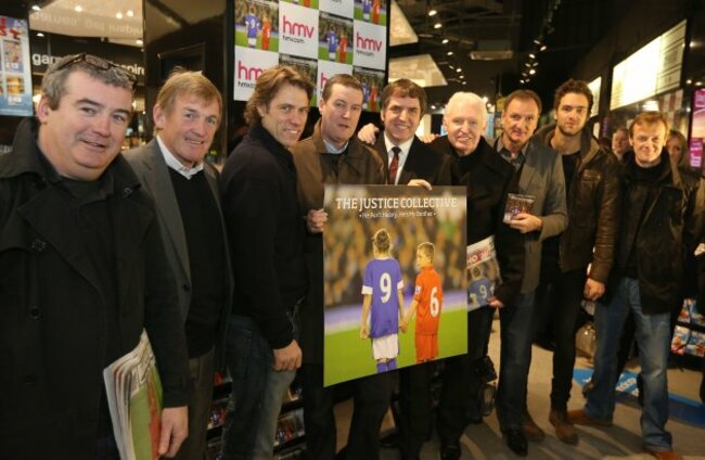 Left to right: Keith Mullin, Kenny Dalglish, John Bishop, Peter Hooton, Steve Rotherham, Mike McCartney, Phil Thompson, Andy Brown and Carl Hunter. Credit: Dave Thompson/PA Wire/Press Association Images