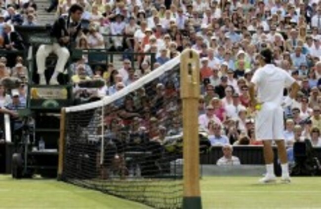 Roger Federer argues with the umpire following Hawk-Eye decision against him, in his match against Spain's Rafael Nadal during The All England Lawn Tennis Championship at Wimbledon. Rebecca Naden/PA Archive/Press Association Images