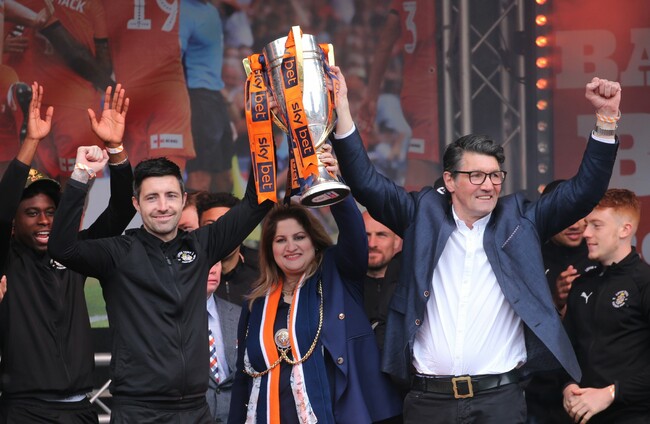 Alan Sheehan (left) celebrates with interim boss Mick Harford after Luton Town won the League One title last season. Isabel Infantes