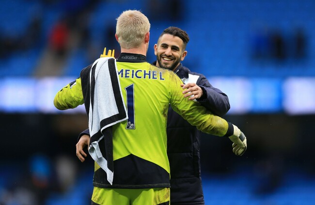 Two of Leicester's stars of the day, Kasper Schmeichel and Riyad Mahrez, congratulate each other after the final whistle. PA Wire/Press Association Images