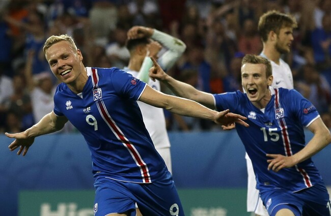 Kolbeinn Sigthorsson, centre, celebrates after scoring his side's second goal during the Euro 2016 round of 16 soccer match between England and Iceland. Claude Paris