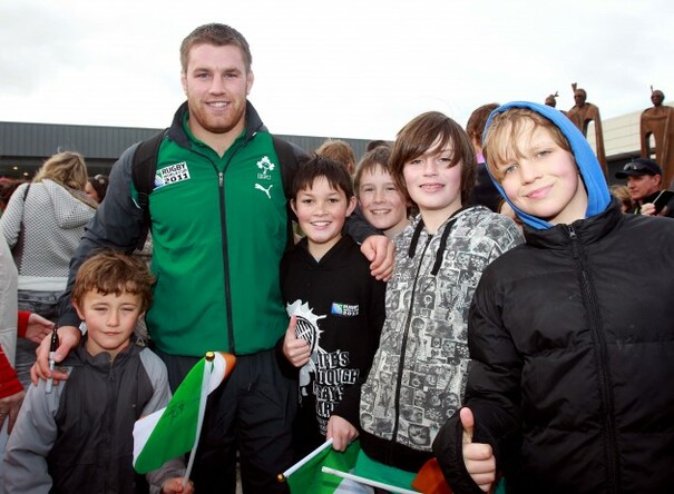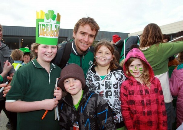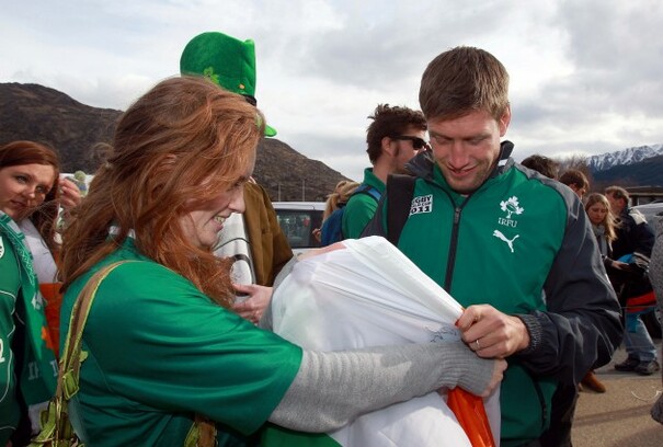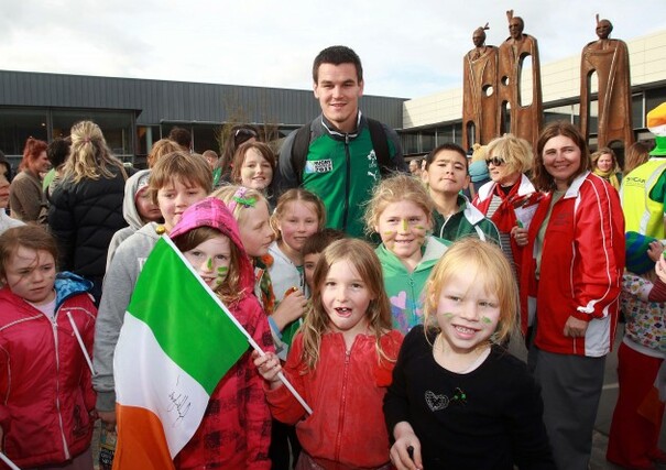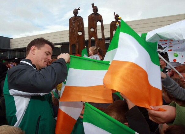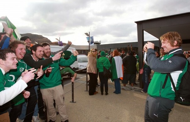 Hundreds of green-clad locals and Irish ex-pats packed the town’s airport to welcome the squad, with O’Driscoll thanking them for their efforts — albeit with a slight geographical slip.