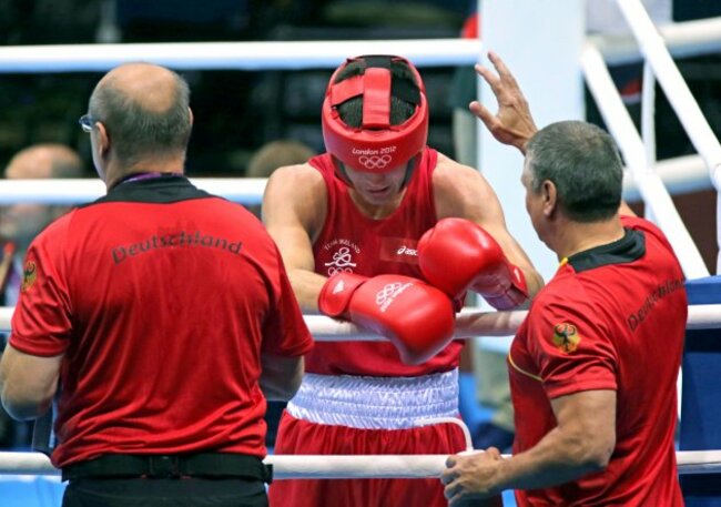 A dejected Darren O’Neill is consoled by his German opponents corner men. Pic: Inpho.