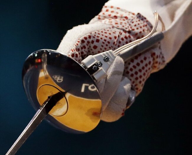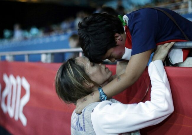 Italy’s Valentina Vezzali celebrates with her seven-year-old son Pietro Giuguano after winning a semi-finals match against France at women’s team foil fencing. Pic: AP Photo/Pat Semansky