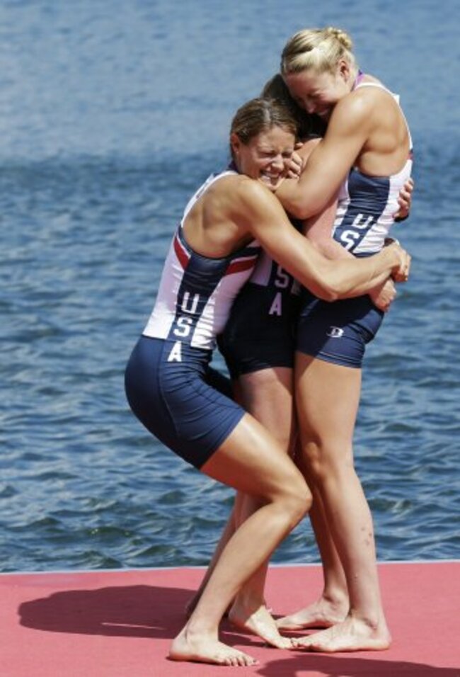 Members of the US women’s eight team embraces coxswain Mary Whipple after winning the gold medal in Eton Dorney. (AP Photo/Natacha Pisarenko)