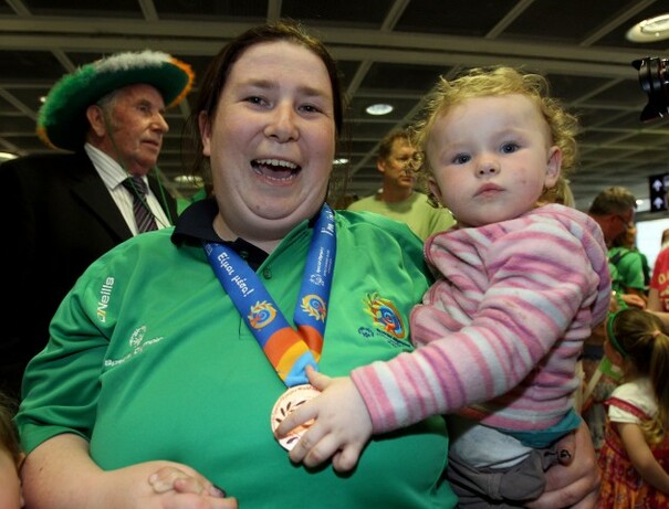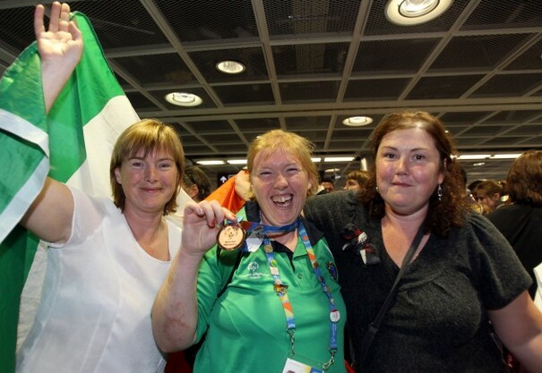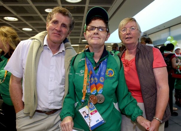 Team Ireland bowler Joyce Haughian from Warrenpoint Co.Down, with her three medals, is greeted by her mother Catherine (left) and sister Fiona (right).
