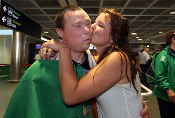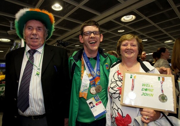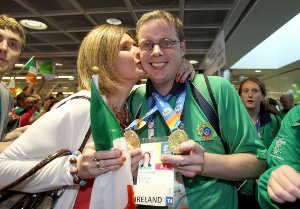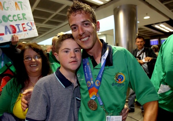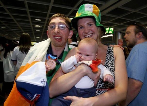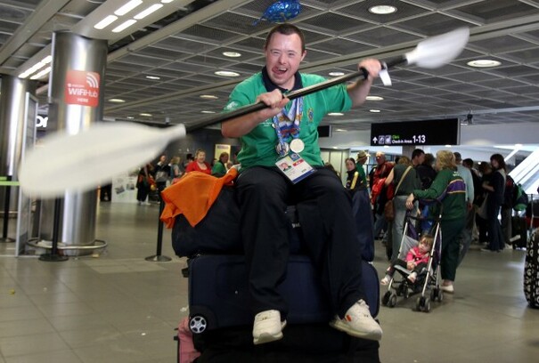 Friends and family of Team Ireland Special Olympic double medal winning kayaker Ruairi O'Toole (centre) welcome him home at Dublin Airport.
