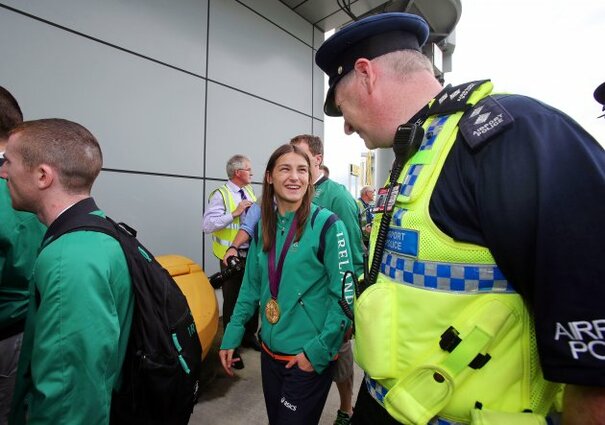 IRELAND’S OLYMPIC ATHLETES landed back into Dublin airport this afternoon, led by gold medal hero Katie Taylor. Here’s how it looked: