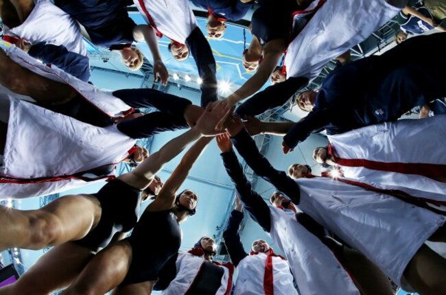 In this photo taken with a fisheye lens, Britain women’s water polo players huddle before the seventh place water polo match at the 2012 Summer Olympics. (AP Photo/Julio Cortez)