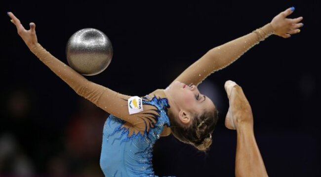 Russia’s Daria Dmitrieva during the rhythmic gymnastics individual all-around qualifications. (AP Photo/Gregory Bull)