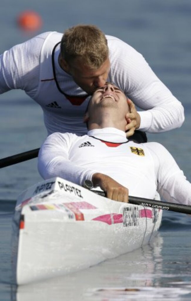 Germany’s Peter Kretschmer and Kurt Kuschela celebrate after winning the gold in the medal men’s kayak double 1000m in Eton Dorney. (AP Photo/Armando Franca,Pool)
