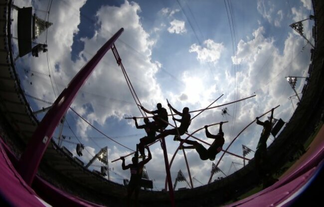 In this multiple exposure photo, Canada’s Damian Warner competes in the men’s decathlon pole vault. (AP Photo/David J. Phillip )