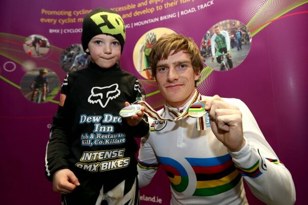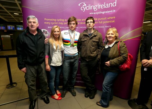 HAVING MADE HISTORY by winning gold and silver medals at the World Track Championships this week, Irish cyclist flew in from Minsk late last night.