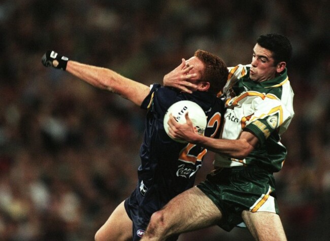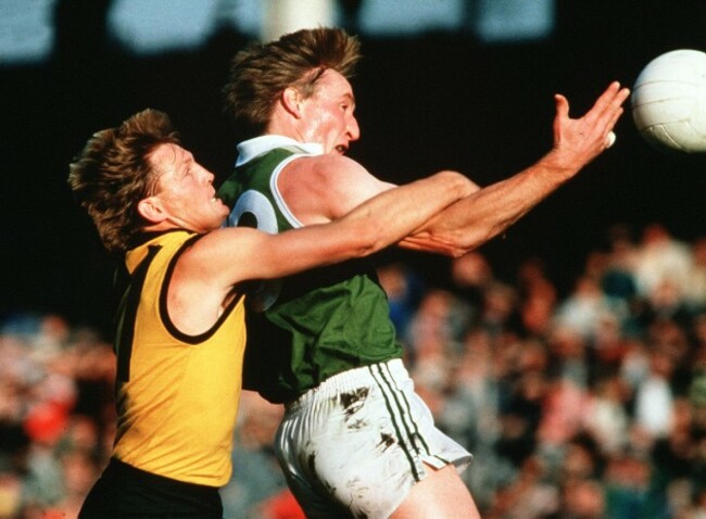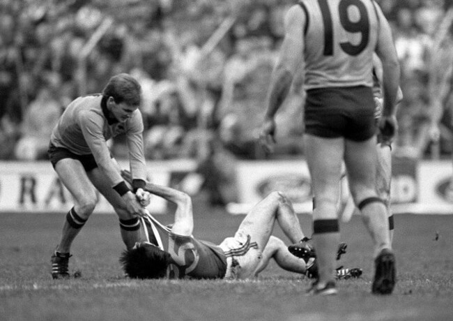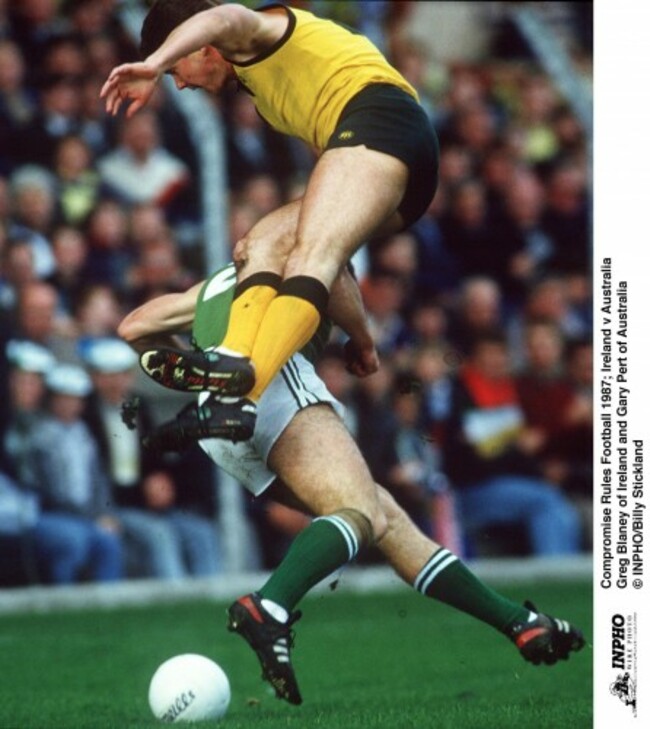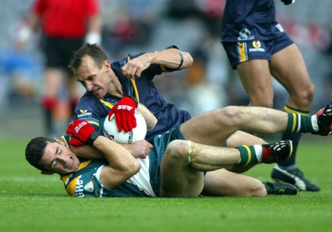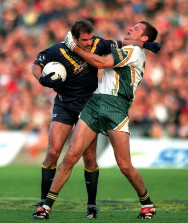 6. Ireland’s Pat Spillane is tackled by Australia’s Scott Sailsbury