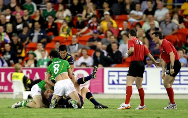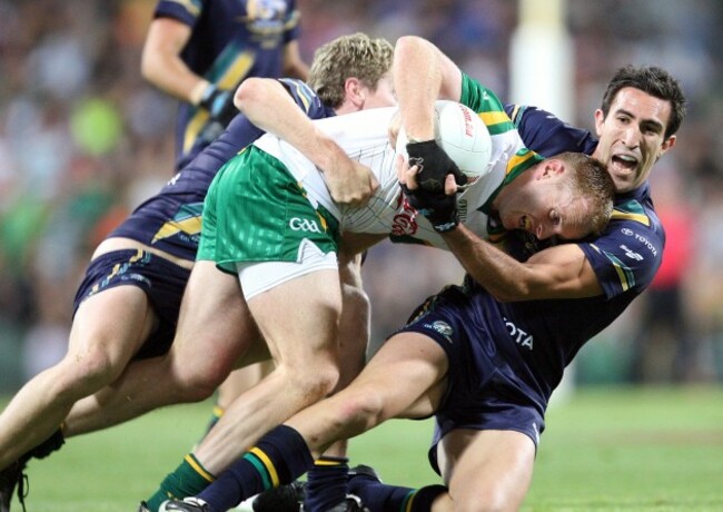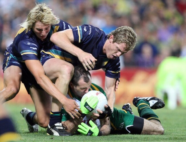 4. Ireland’s Jim Reilly is tackled by Michael Mitchell of Australia