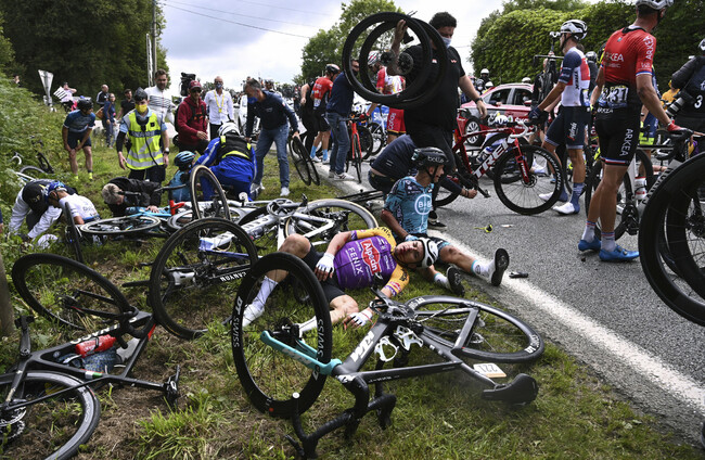 German rider Tony Martin brushed into her, lost his balance and fell, causing a sickening wave of falls that swept through most of the peloton, leaving them in a tangled mess of bikes and bodies.