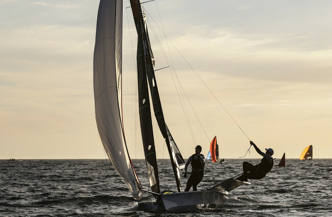 France’s Lucas Rual and Emile Amoros were crowned 49er European Champions, narrowly holding off Poland’s Dominik Buksak and Szymon Wierzbicki to win by just 0.4 points, with New Zealand’s Isaac McHardie and William McKenzie taking bronze.