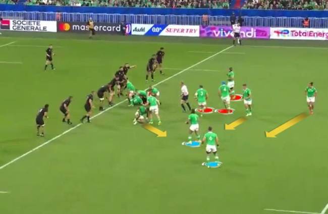 So as Henderson and Ringrose get to the breakdown as Sheehan is carrying, we see that Furlong, Beirne, and Doris [red below] now work around the corner to the right.